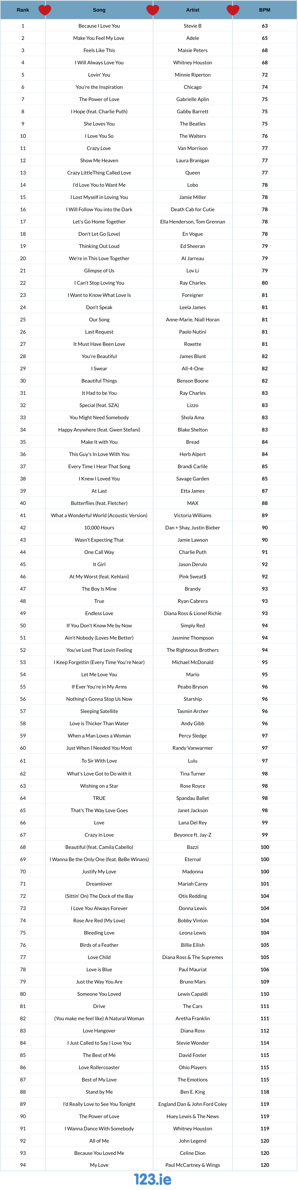 Here is the full list of the least distracting love songs to help you choose what to add to your playlist this Valentine’s Day weekend.